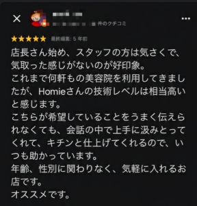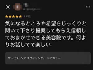 久しぶりのパーマで不安でしたが、骨格やはえ癖の説明や、お手入れのやり方を丁寧にしてもらえ、安心して施術を受けられました。仕上がりも大満足です。これからよろしくお願いいたします。